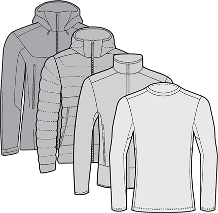 기상 조건, 활동의 강도, 활동의 종류 및 기후 변화에 따라 유연하고 민첩하게 대응할 수 있는 레이어링 방식입니다. 땀과 열이 너무 많이 날 때는 보온 재킷이나 쉘 재킷을 벗고, 반대로 추위가 느껴질 땐 재킷을 껴입어 주면서 최적의 레이어링 시스템을 선택할 수 있습니다.